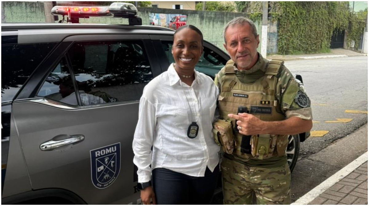 A GCM Sara Andrade dos Reis ao lado de um amigo